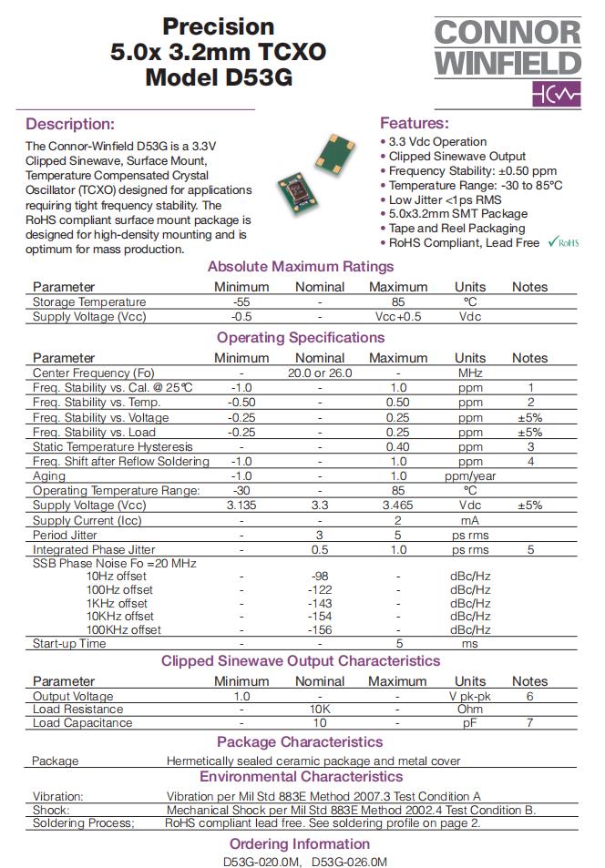 D53G-020.0M|TCXO晶振振蕩器|6G路由器晶振,歐美進口晶振,ConnorWinfield晶振,D53G有源晶振,D53G-020.0M晶振,5032mm晶振,TCXO晶體振蕩器,SMD晶振,頻率20MHz,電壓3.3V,工作溫度-30~85°C,頻率穩(wěn)定性0.5ppm,低老化晶振,低相噪晶振,6G路由器晶振,智能穿戴晶振,物聯(lián)網(wǎng)晶振,移動通信晶振.