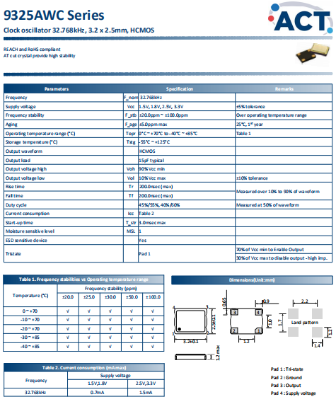 ACT晶振,9325AWC晶振,石英晶體振蕩器.3225mm體積的晶振,可以說(shuō)是目前小型數(shù)碼產(chǎn)品的福音,目前超小型的智能手機(jī)里面所應(yīng)用的就是小型的石英晶振,該產(chǎn)品最適用于無(wú)線通訊系統(tǒng),無(wú)線局域網(wǎng),已實(shí)現(xiàn)低相位噪聲,低電壓,低消費(fèi)電流和高穩(wěn)定度,超小型,質(zhì)量輕等產(chǎn)品特點(diǎn),產(chǎn)品本身編帶包裝方式,可對(duì)應(yīng)自動(dòng)高速貼片機(jī)應(yīng)用,以及高溫回流焊接(產(chǎn)品無(wú)鉛對(duì)應(yīng)),為無(wú)鉛產(chǎn)品.