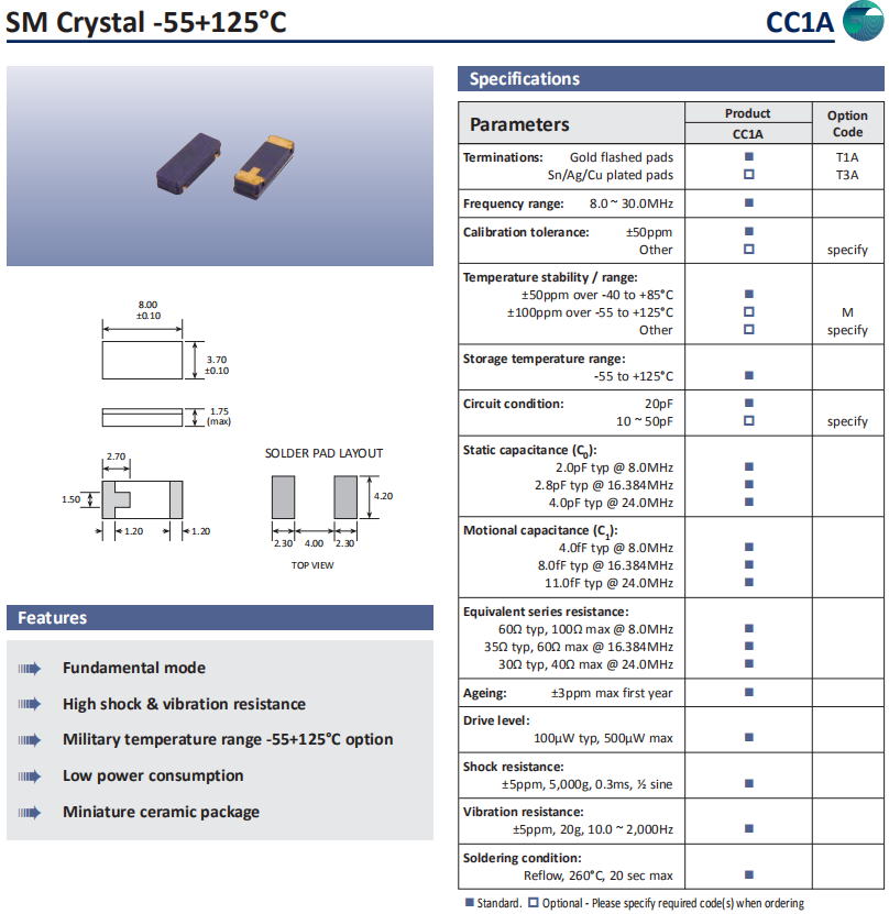 Golledge晶振,CC1A晶振,貼片石英晶體.石英貼片晶振,體積小,焊接可采用自動貼片系統,產品本身小型,表面貼片晶振,特別適用于有小型化要求的電子數碼產品市場領域,因產品小型,薄型優勢,耐環境特性,包括耐高溫,耐沖擊性等,在移動通信領域得到了廣泛的應用,晶振產品本身可發揮優良的電氣特性,滿足無鉛焊接的高溫回流溫度曲線要求.