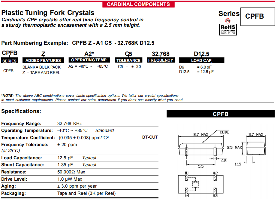 Cardinal晶振,CPFB晶振,石英晶體諧振器.32.768K系列具有超小型,薄型,質地輕的表面貼片音叉型石英晶體諧振器,晶振產品本身具備優良的耐熱性,耐環境特性,在辦公自動化,家電領域,移動通信領域可發揮優良的電氣特性,符合無鉛標準,滿足無鉛焊接的回流溫度曲線要求,金屬外殼的石英晶振使得產品在封裝時能發揮比陶瓷晶振外殼更好的耐沖擊性能.