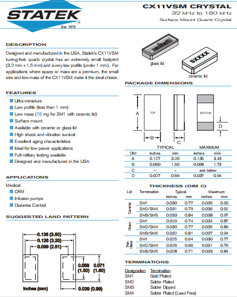 1970年,Statek晶振公司開創(chuàng)了石英計時元件小型化技術,革新了頻率控制行業(yè).今天,Statek進口晶振在設計和制造超微型石英晶體,振蕩器和傳感器方面延續(xù)了創(chuàng)新的傳統(tǒng).自成立以來,Statek一直是創(chuàng)新,服務和質量的代名詞.所有產(chǎn)品都是在美國設計制造和測試的.