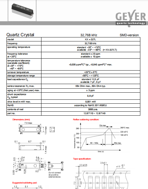 Geyer晶振,KX-327L晶振,環保石英晶體.貼片石英晶體,體積小,焊接可采用自動貼片系統,產品本身小型,表面貼片晶振,特別適用于有小型化要求的電子數碼產品市場領域,因產品小型,薄型優勢,耐環境特性,包括耐高溫,耐沖擊性等,在移動通信領域得到了廣泛的應用,晶振產品本身可發揮優良的電氣特性,滿足無鉛焊接的高溫回流溫度曲線要求.