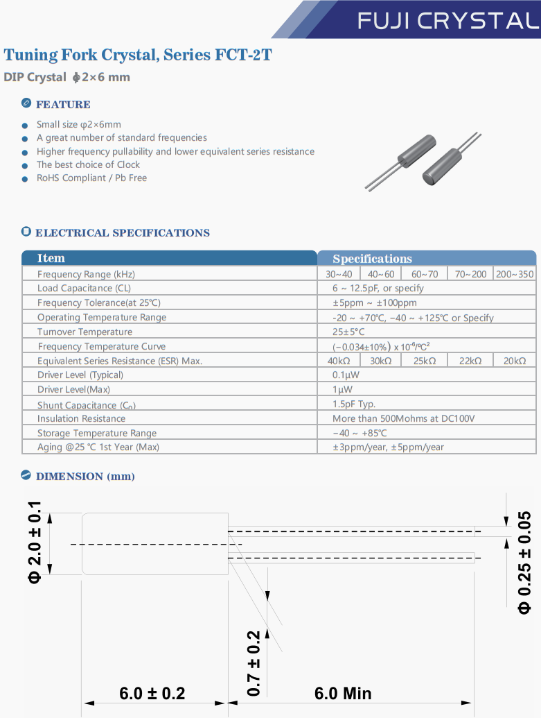| FCT2T03276806P1 | Fuji晶振 | FCT-2T | 32.768 kHz | 6pF | -10°C ~ 60°C |