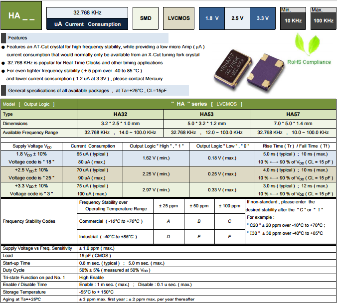 MERCURY晶振,32.768K晶體振蕩器,HA53晶振.石英晶體振蕩器在設計時就與各款型號IC匹配等相關技術,使用IC與晶片設計匹配技術:是高頻振蕩器研發及生產過程必須要解決的技術難題.在設計過程中除了要考慮石英晶體諧振器具有的電性外,還有石英晶體振蕩器的電極設計等有它的特殊性,必須考慮振蕩器的供應電壓,起動電壓和產品上升時間,下降時間等相關參數.