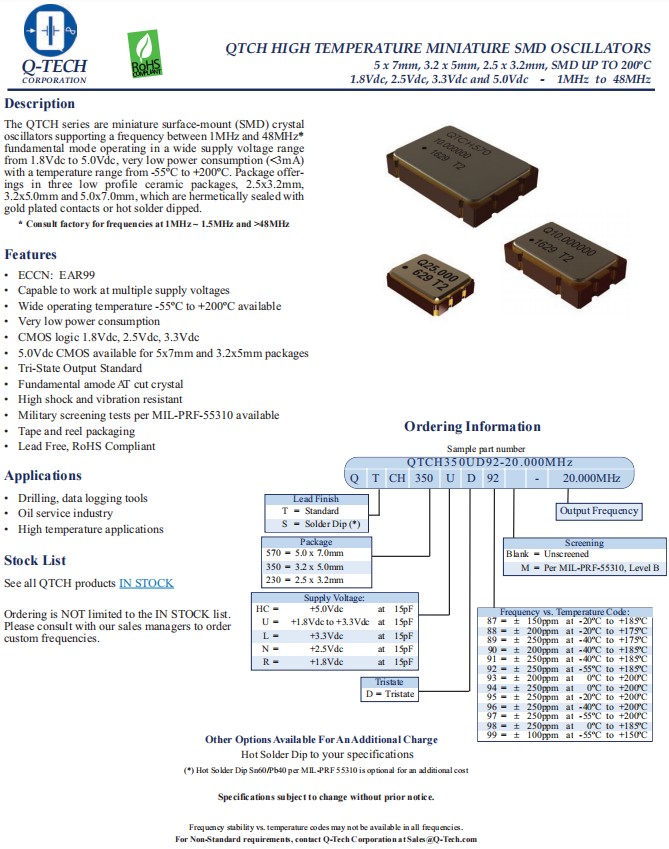QTCH570ND90-40.000MHz|美國Q-Tech進口晶振|6G模塊晶振,Q-Tech晶振,歐美進口晶振,型號QTCH570,編碼QTCH570ND90-40.000MHz,是頻率40MHz的基模AT切割晶體,有源晶振,可根據(jù)MIL-PRF-55310提供軍事篩選測試,尺寸7050mm,電壓2.5V,負載15pF,低功耗晶振,無鉛環(huán)保晶振,耐高溫晶振,6G模塊晶振,鉆井、數(shù)據(jù)記錄工具晶振,石油服務(wù)行業(yè)晶振,高溫應(yīng)用晶振.