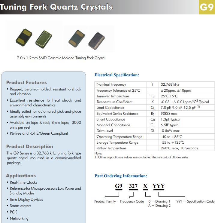 G93270002 | Diodes晶振 | SaRonix-eCera™ G9 | kHz Crystal (Tuning Fork) | 32.768kHz | - |