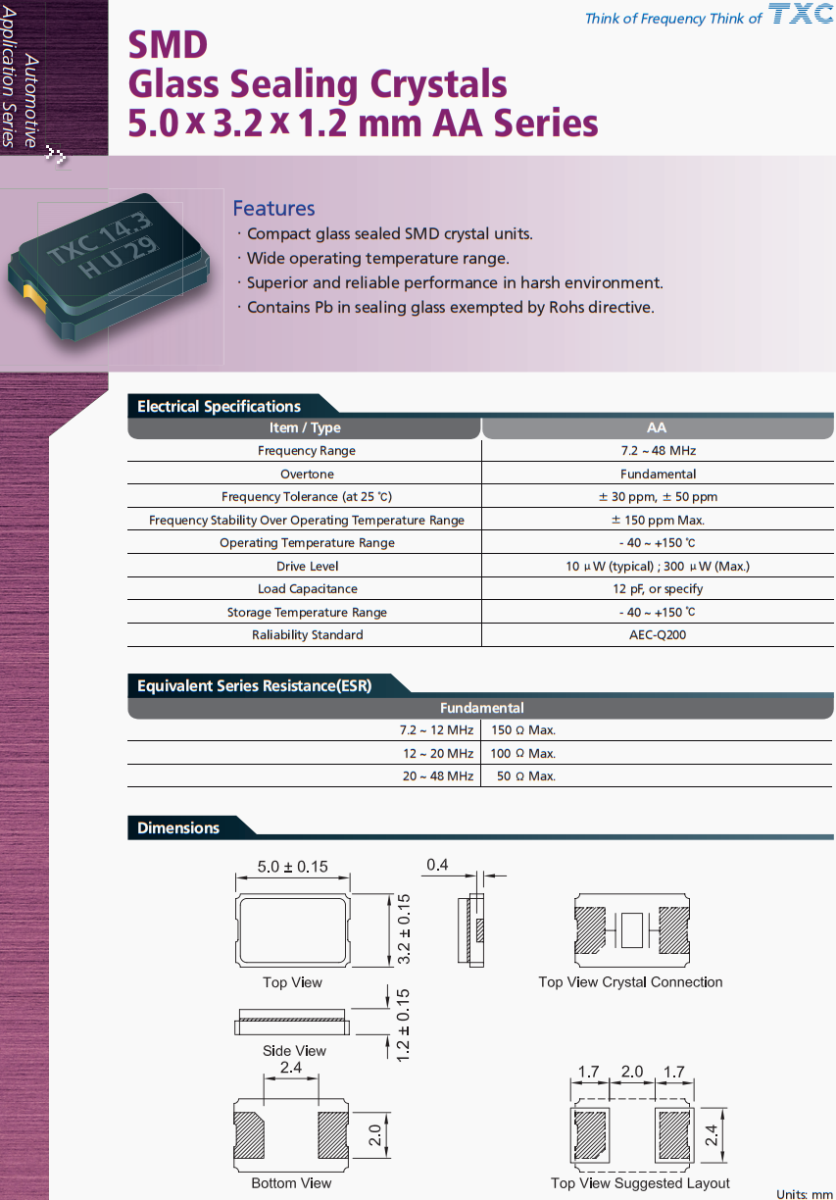 TXC臺產(chǎn)晶振,AA-14.31818MAGD-T晶振,汽車空調(diào)系統(tǒng)晶振,AA系列SMD,玻璃密封晶體,5.0 x 3.2 x 1.2 mm ,功能。緊湊的玻璃密封SMD晶體單元。工作溫度范圍廣。在惡劣環(huán)境下性能優(yōu)越可靠。不受Rohs指令限制的密封玻璃含鉛。臺灣TXC晶振公司,晶技晶振,無源晶振,5032晶振,AA-8.000MALV-T晶振,汽車晶振,汽車電動天窗控制系統(tǒng)晶振,臺灣晶振,貼片晶振,二腳晶振,石英晶振,高品質(zhì)晶振,車載多媒體晶振,行車記錄儀晶振,低損耗晶振,耐高溫晶振,耐沖擊晶振