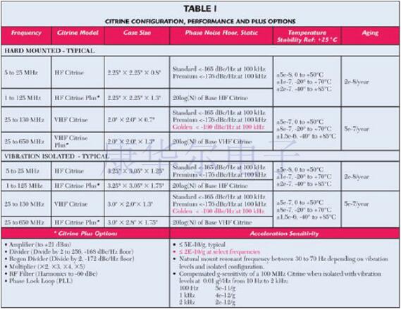 新型Citrine系列晶體振蕩器專為在要求靜態(tài)和動態(tài)條件下具有低相位噪聲性能的最苛刻應(yīng)用提供廣泛的貼片晶振產(chǎn)品.黃水晶振蕩器可以配置為1~650MHz之間的任何固定頻率.黃水晶系列有八種配置.低頻HF振蕩器和VHF振蕩器均可使用,也可以不使用隔振系統(tǒng).而且,“PLUS”系列還提供HF和VHFCitrines,當(dāng)應(yīng)用需要額外的功能時,可添加乘法器,分頻器,放大器,濾波器和雙輸出. Citrine系列具有多種包裝配置,可以根據(jù)頻率,所需的選件,性能規(guī)格和其他應(yīng)用注意事項(xiàng)進(jìn)行選擇.有關(guān)標(biāo)準(zhǔn)Citrine配置和性能選項(xiàng),請參見表1. 黃水晶靜態(tài)相位噪聲性能