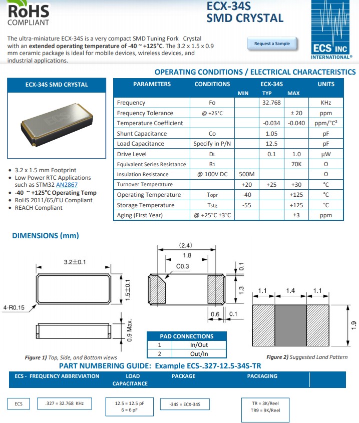 ECS晶振推出超小型ECX-34S系列,編碼ECS-.327-12.5-34S-TR,是一款非常緊湊的SMD音叉晶體,32.768kHz晶振,兩腳貼片晶振,擴展工作溫度范圍為-40℃至+125℃。小體積尺寸3.2x1.5x0.9mm陶瓷封裝,非常適合移動設備、無線設備和工業應用,STM32 AN2867等低功耗RTC應用,-40℃至+125℃工作溫度,符合RoHS 2011/65/EU標準,符合REACH標準.