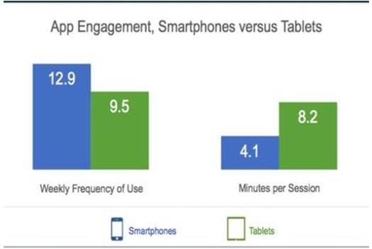 最后,我們比較了智能手機(jī)和平板電腦上的用戶參與度。平均來看,消費(fèi)者會更頻繁地使用智能手機(jī)應(yīng)用,但每次使用時間較短。而消費(fèi)者會更多地使用平板電腦去消費(fèi)媒體。由于平板電腦更多地在晚間時段使用,因此這一趨勢是合理的。相反地,消費(fèi)者會在一天中的多個時段使用智能手機(jī)應(yīng)用,完成諸如登錄社交網(wǎng)絡(luò)或使用工具等應(yīng)用。