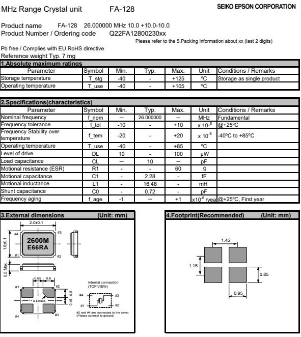 | Q22FA1280023000 | 2 x 1.6 x 0.5mm | FA-128 | 26.000000 MHz | 10 pF | +/-10 ppm |
