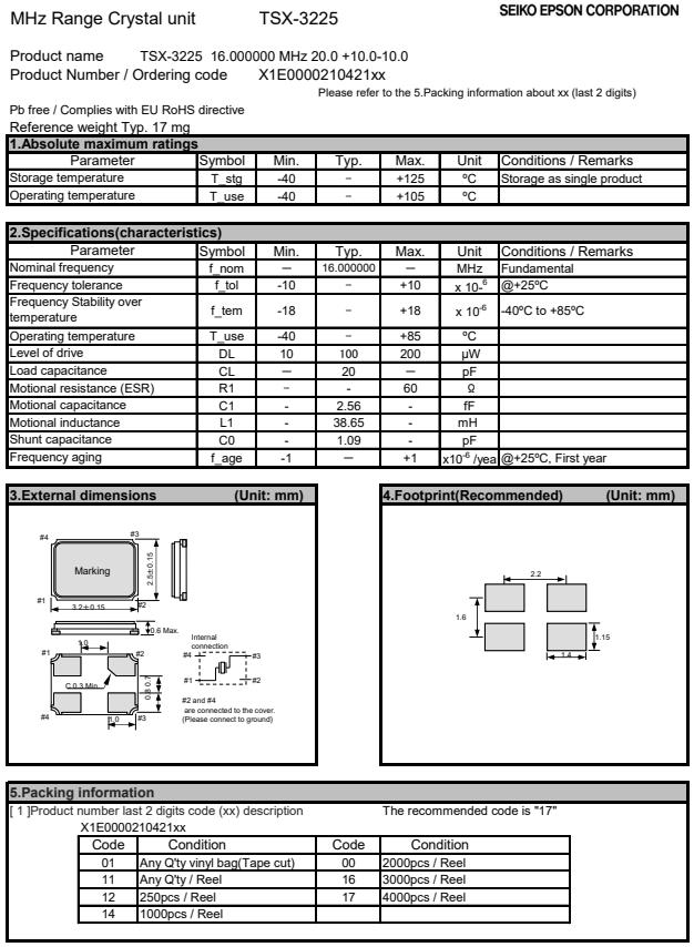 | X1E000021042116 | 3.2 x 2.5 x 0.6mm | TSX-3225 | 16.000000 MHz | 20 pF | +/-10 ppm | +/-18 ppm | -40 to +85 °C |