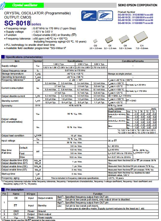 | X1G005601020000 | SG-8018CG | 8.050000 MHz | 2.50 x 2.00 x 0.80 mm | CMOS | 1.620 to 3.630 V | -40 to 105 °C | +/-50 ppm |