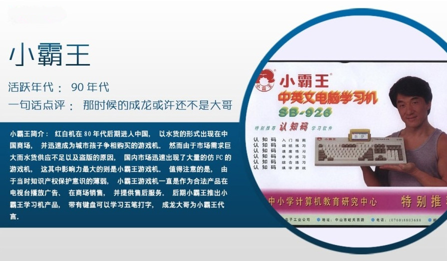 小霸王游戲機一聽就很熟悉吧,在那個年特別火,而且是于成龍代言的,那時候的成龍或許還不是大哥,小霸王游戲機一直是作為合法產品在電視臺播放廣告、在商場銷售,并提供售后服務。后期小霸王推出小霸王學習機產品,帶有鍵盤可以學習五筆打字,成龍大哥為小霸王代言。