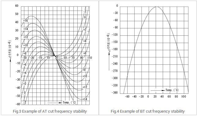 根據(jù)曲線的形狀,將晶體的頻率溫度特性分為2類.一個是三次曲線,另一個是二次曲線.典型的頻率溫度特性和BT削減在圖3和圖4所示,分別.在切晶體單元中最廣泛使用的是因?yàn)樗鼈冊谑覝胤秶鷥?nèi)產(chǎn)生較小的頻率變化響應(yīng)溫度變化.