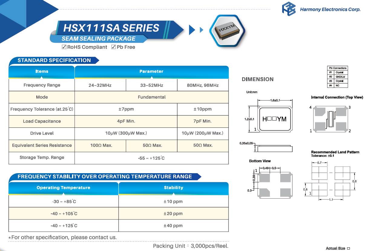 | X2C016000B81H-HPU | 加高晶振 | HSX211S | 16 MHz | ±20ppm | 8pF |