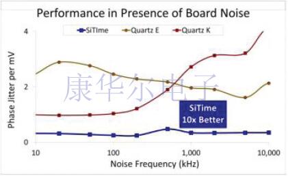 圖3顯示了對于50mV峰峰值電源噪聲,積分相位抖動與電源開關噪聲頻率的關系,并將石英振蕩器與SiTimeMEMS振蕩器的結果進行了比較.如圖所示,在幾乎所有噪聲頻率下,SiTimeMEMS振蕩器的抖動都較低.與典型的石英振蕩器制造商不同,SiTime使用包括PSNS電路在內的先進模擬設計技術為其MEMS振蕩器設計模擬電路,以保護振蕩器免受電源引起的抖動的影響. 圖3:SiTimeMEMS振蕩器(下部線路)和石英振蕩器在存在50mV峰峰值電源噪聲的情況下的相位抖動與電源開關噪聲頻率的關系有關EM-的測量結果和測試方法的更多詳細信息感應的相位噪聲和電源感應的相位抖動,請參見SiTime技術論文MEMS和基于石英的振蕩器的電磁敏感性比較.